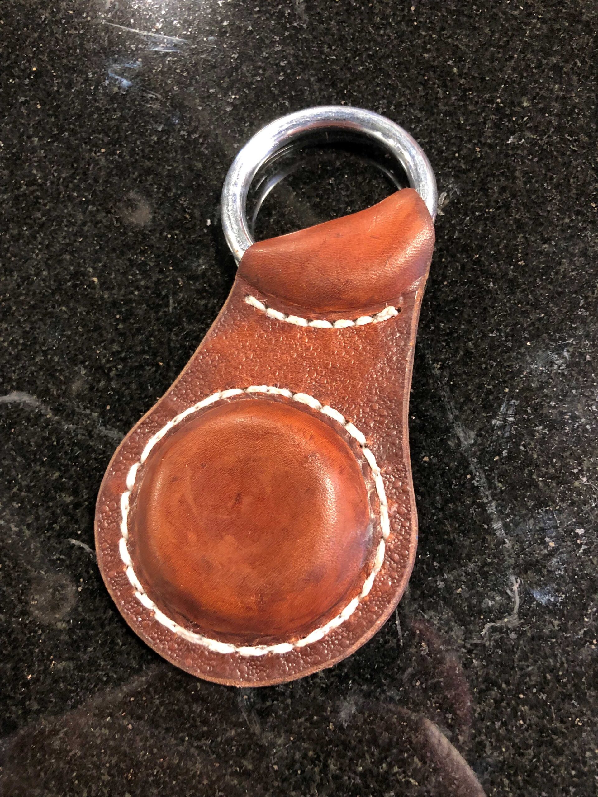 Made from veg tan leather, wax sealed, lead weight (approx.4oz.) and a round steel ring.
